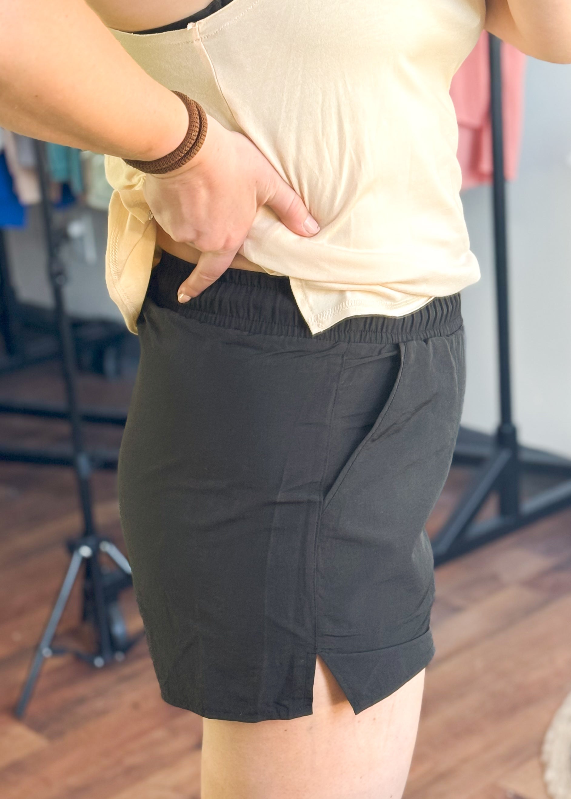 New athletic summer staple the unlined, with pockets black shorties! Wearing size small but with the booty I could have been totally fine in a medium. They seem to have a tummy control effect!