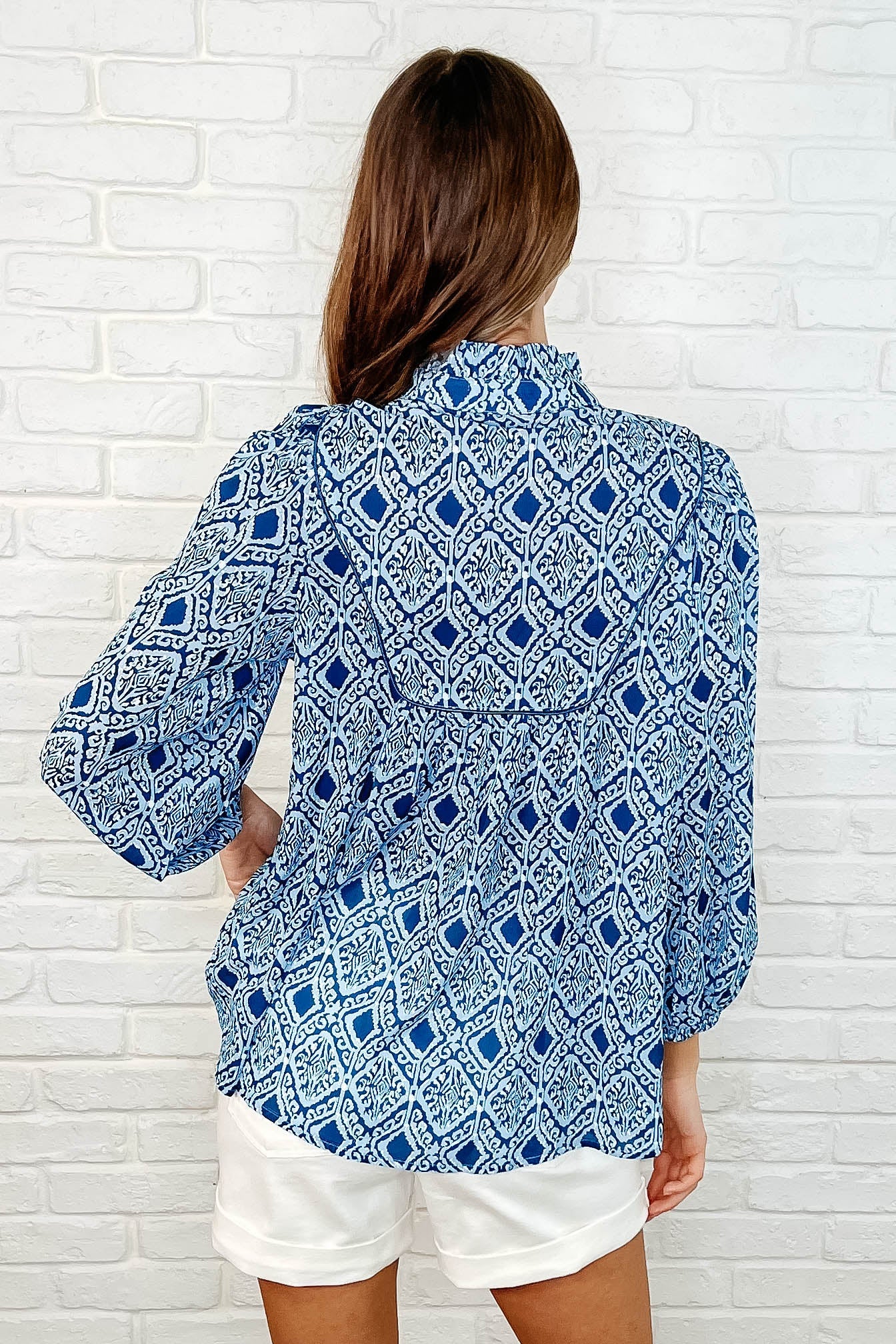 - Ruffled V-High Neckline
