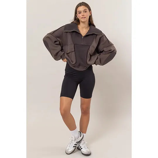 Complete your laid-back look with this half-zip sweatshirt, crafted from mineral-washed brushed French terry fabric. It features a stand collar, drop shoulders with reversed seams, long sleeves with cinched cuffs, and practical front flap pockets.