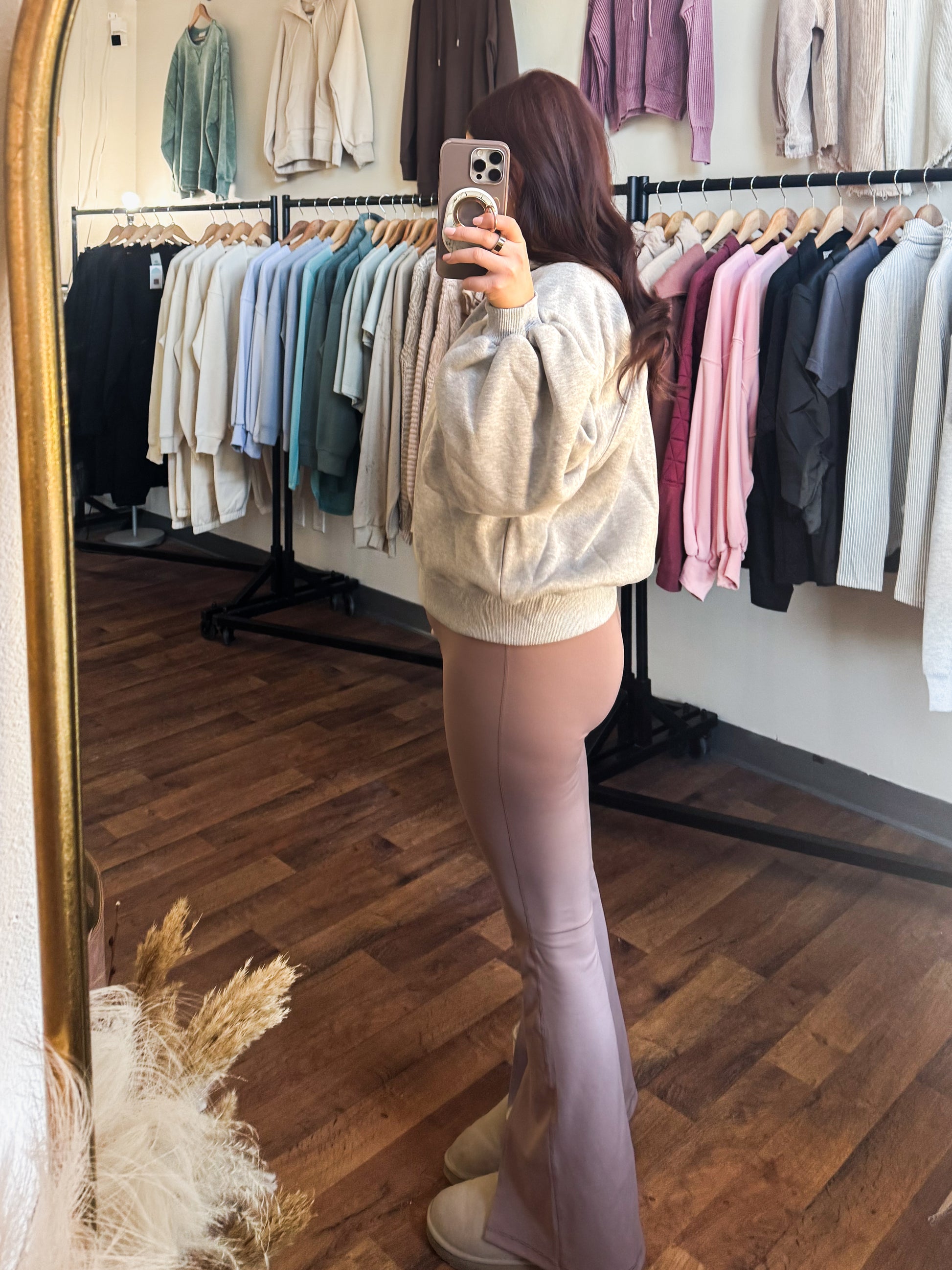 Indulge in luxurious comfort with our Piper Snap Sweatshirt Pullover in H. Grey, as modeled by Megan in size small. Embrace the elegance of bubble sleeves and embrace a new level of high-end fashion.