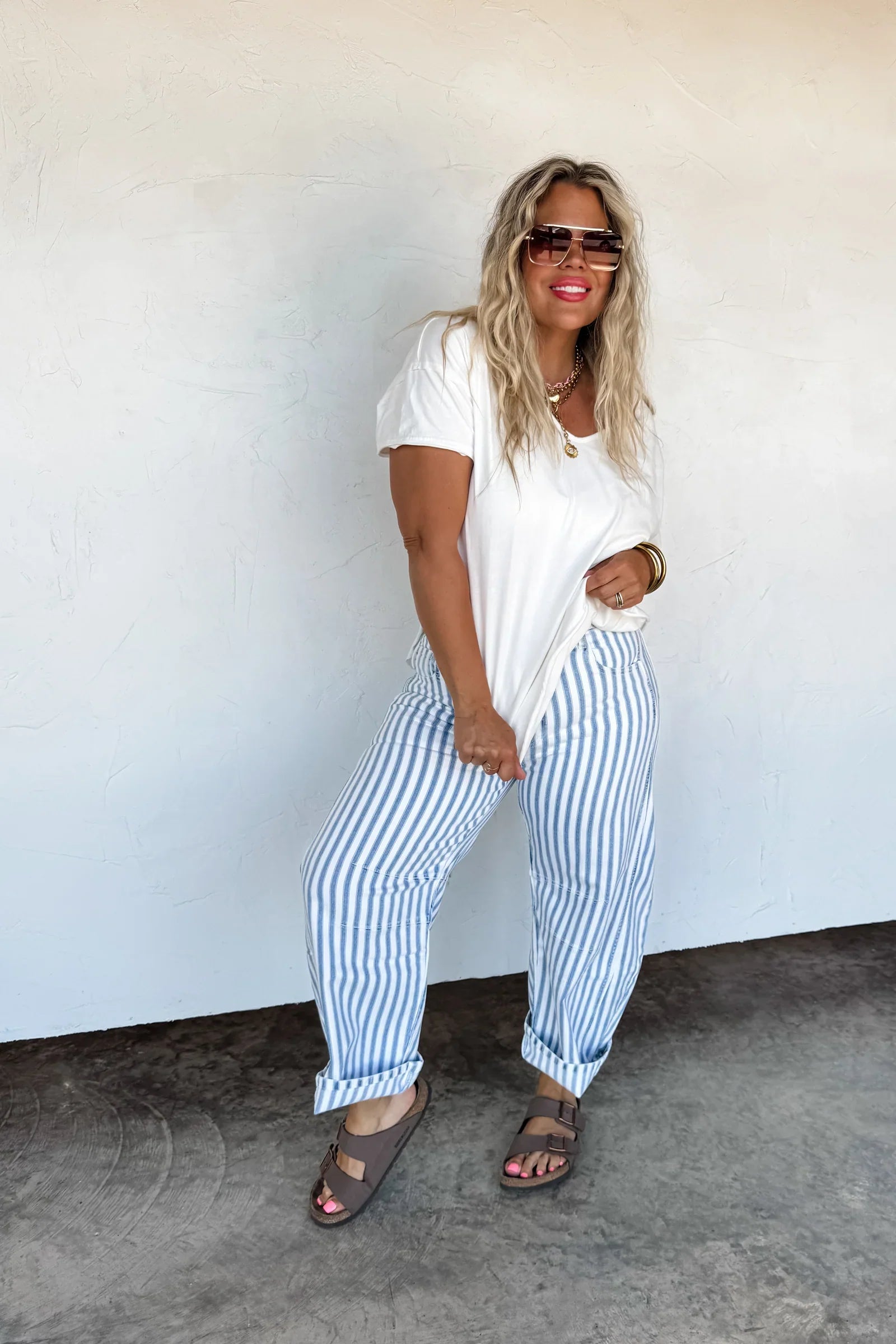 These trendy stripe barrels have more of a mid-rise fit, semi stretchy denim, and wide-legs that taper at the ankle. Darted at the knees to keep the "flare out" form.  Features beltloops and detailed seams on sides. High quality look! Medium wash with a dark wash dyed star pattern scattered on the jean! So cute!