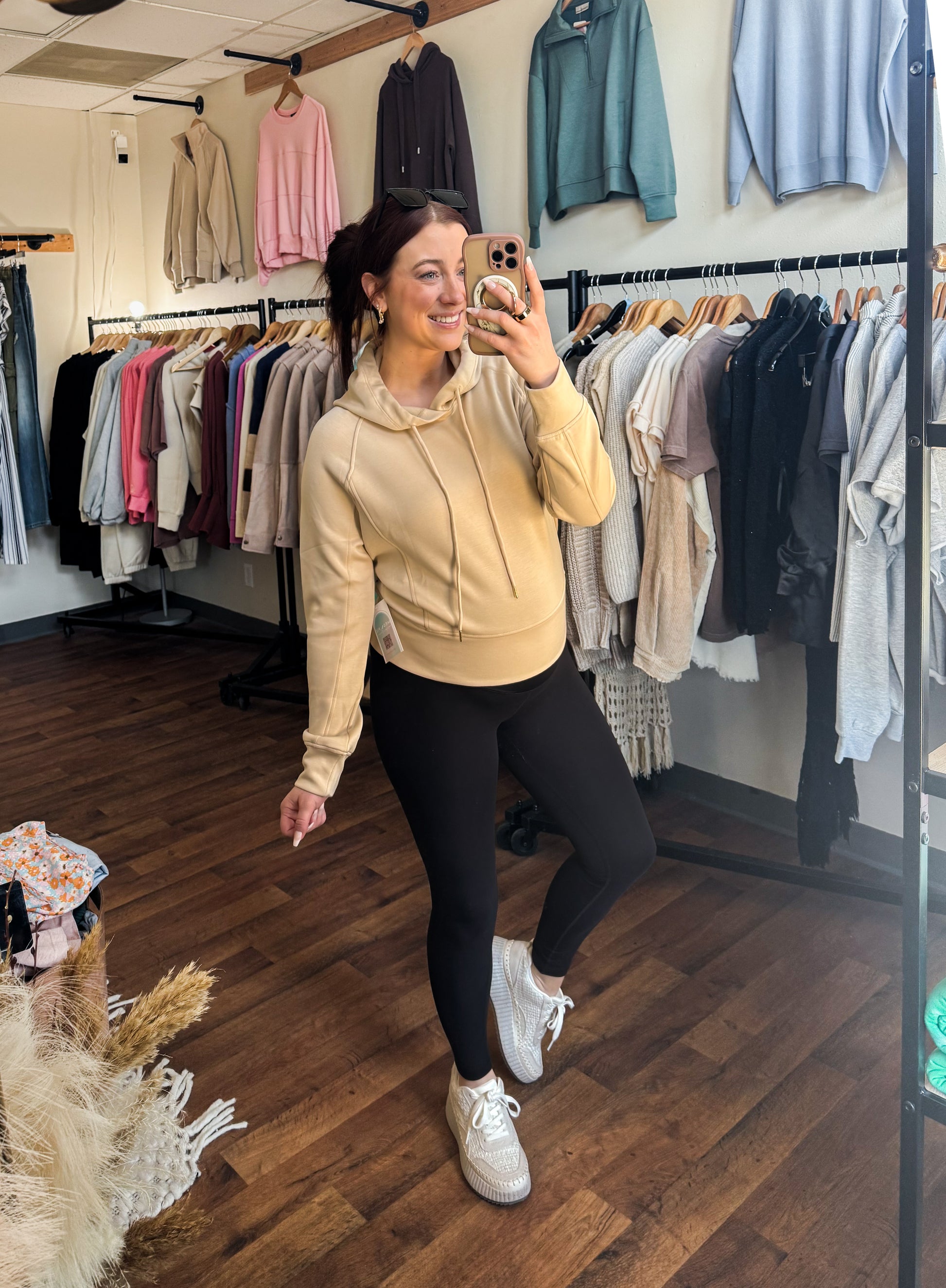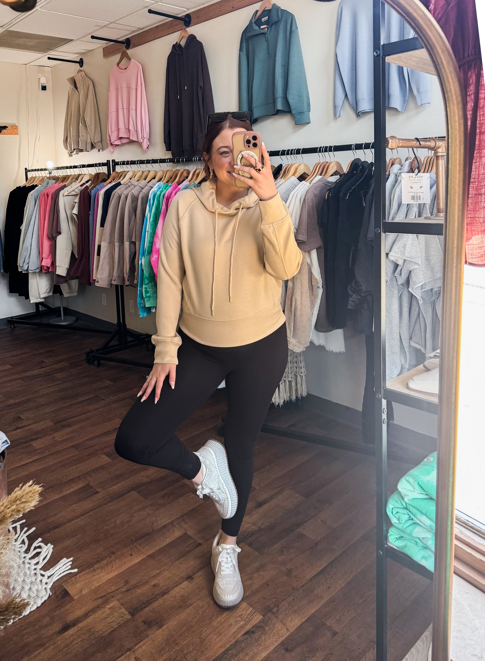 Introducing our Slightly Cropped Athletic Hoodie in Honeycomb, made from a blend of 50% rayon, 45% polyester, and 5% spandex. Perfect for a casual yet chic look, this hoodie is carefully designed for comfort and style. The unique honeycomb color adds an extra touch of sophistication to your wardrobe.